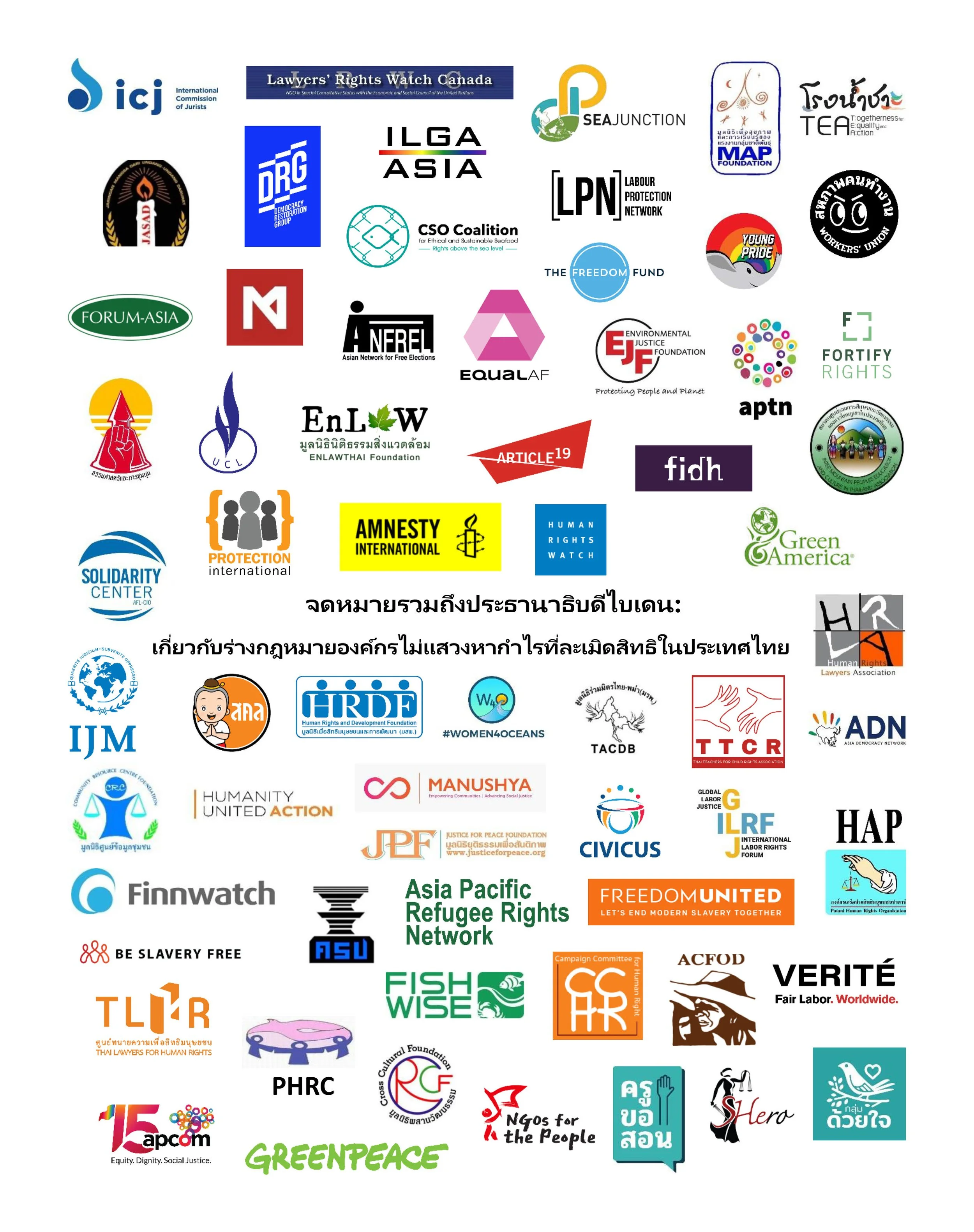 พวกเราที่มีรายชื่อด้านท้ายเป็นองค์กรไม่แสวงหากาไร และต้องการเขียนจดหมาย เพื่อแสดงข้อกังวลอย่างร้ายแรงเกี่ยวกับร่างพระราชบัญญัติการดาเนินกิจกรรมขององค์กรไม่แสวงหากาไร พ.ศ....ของประเทศไทย ซึ่งคณะรัฐมนตรีให้ความเห็นชอบในหลักการเมื่อวันที่ 4 มกราคม 2565 การประกาศใช้ร่างกฎหมายนี้ จะทาให้เกิดการละเมิดอย่างเป็นระบบต่อสิทธิที่จะมีเสรีภาพในการสมาคม และเสรีภาพด้านการแสดงออกของกลุ่มไม่แสวงหากาไร เราจึงกระตุ้นให้ท่านเรียกร้องให้รัฐบาลไทย ถอนร่างกฎหมายนี้ ในระหว่างที่ท่านจะได้ประชุมกับนายกรัฐมนตรีประยุทธ์ จันทร์โอชา และตัวแทน ในระหว่างการประชุมสุดยอดอาเซียน - สหรัฐฯ สมัยพิเศษ ซึ่งจะมีขึ้นที่ทาเนียบขาวในวันที่ 12-13 พฤษภาคม 2565
